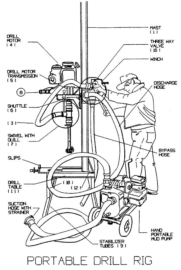The LS-100 is a small, portable mud rotary drilling machine made by Lone Star Bit Company in Houston, Texas. Using this small drill rig, it is possible to rapidly complete safe, reliable water wells. As discussed by Hamann (1992), advantages of the LS-100 include: comparatively low cost, portability, and speed and depth to which the rig can go relative to manual methods (see Table 2).